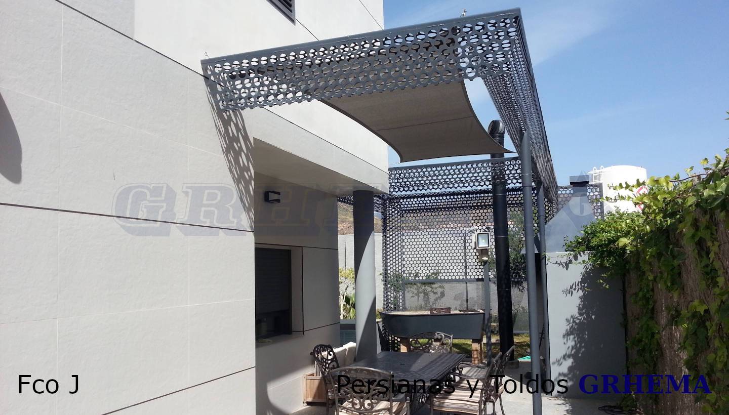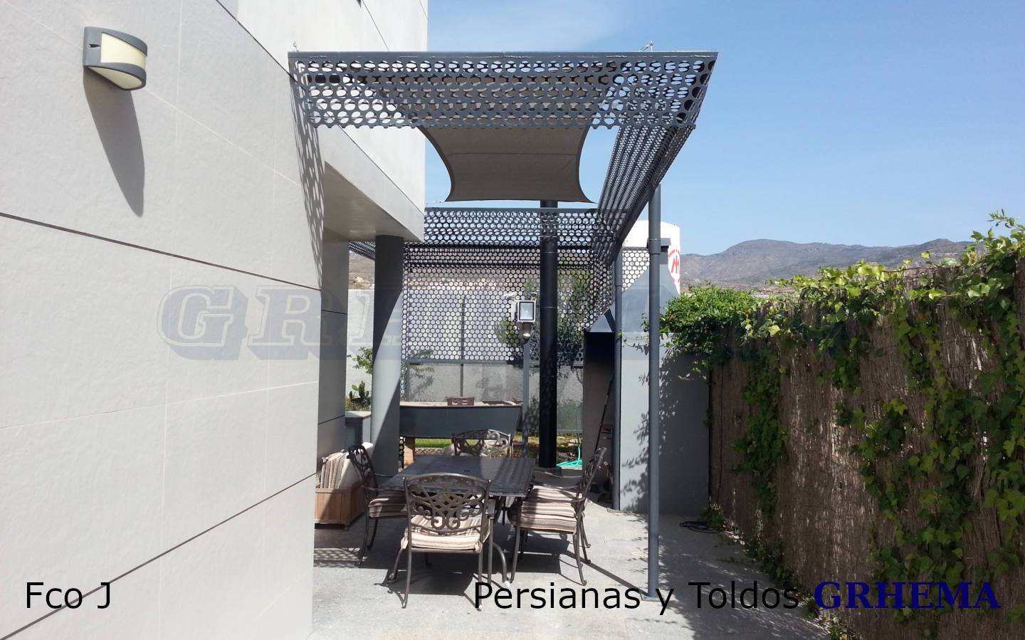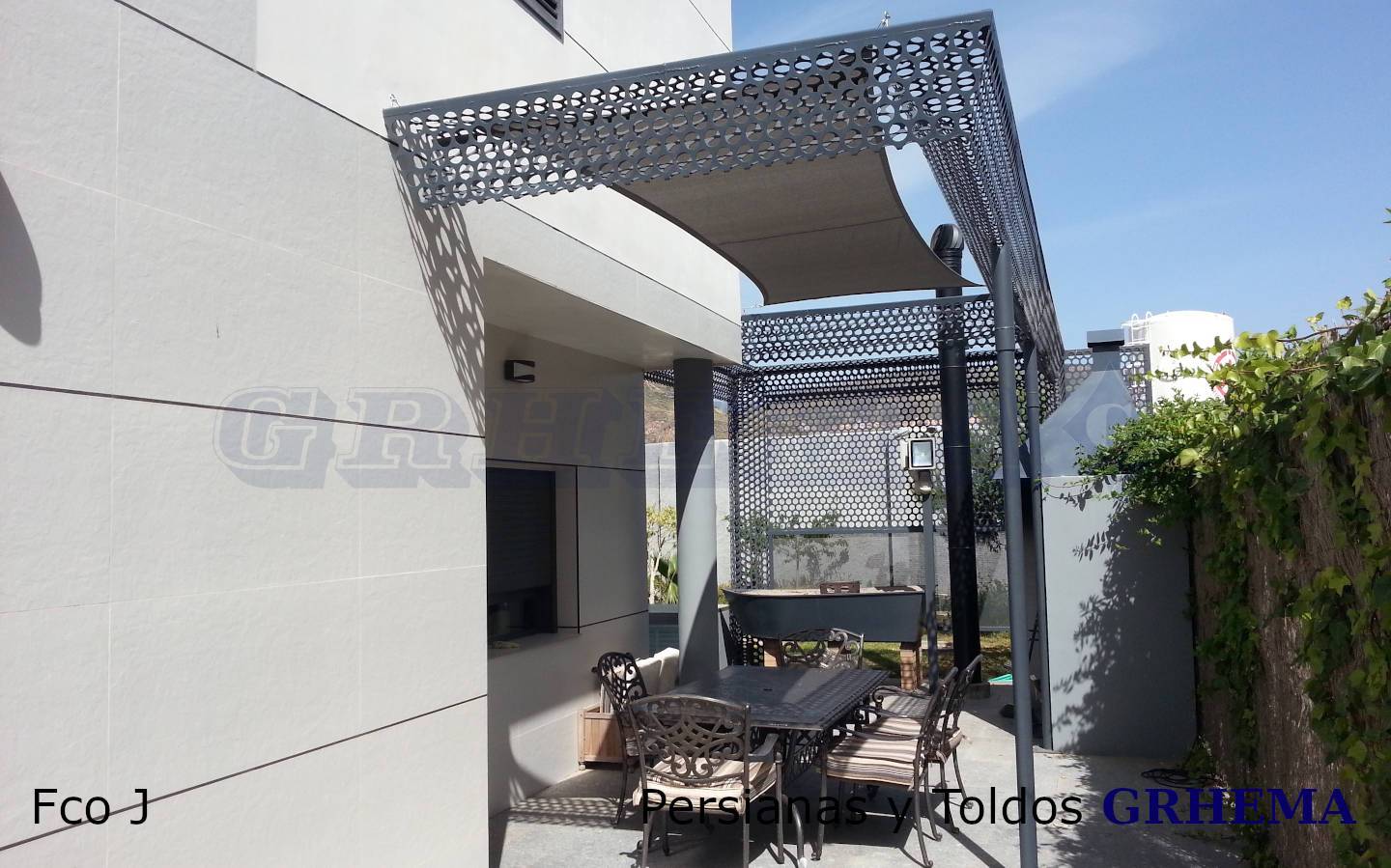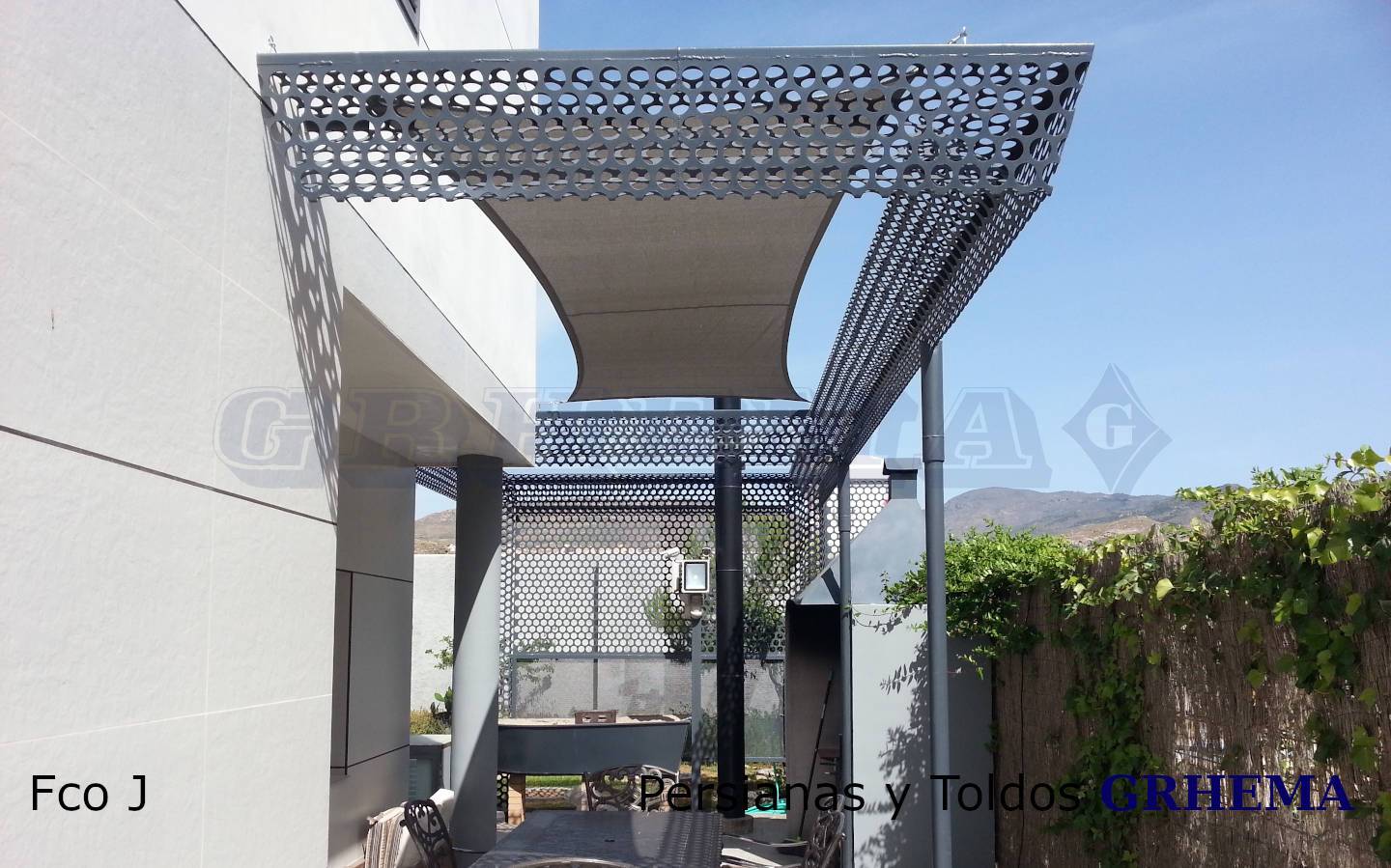 • Formado por un toldo plano junto a una pérgola decorativa de aluminio con perfiles 80x40 mm.