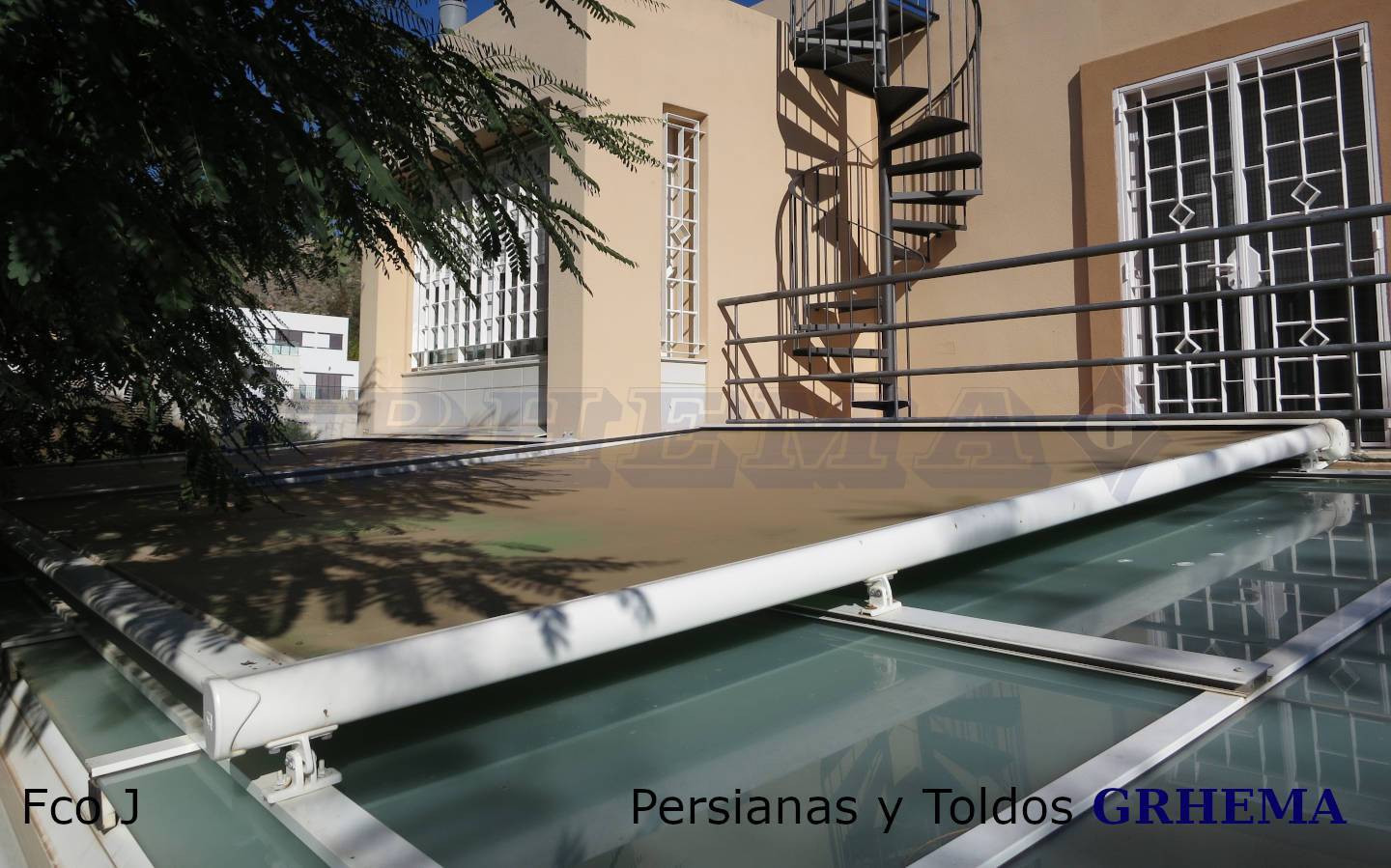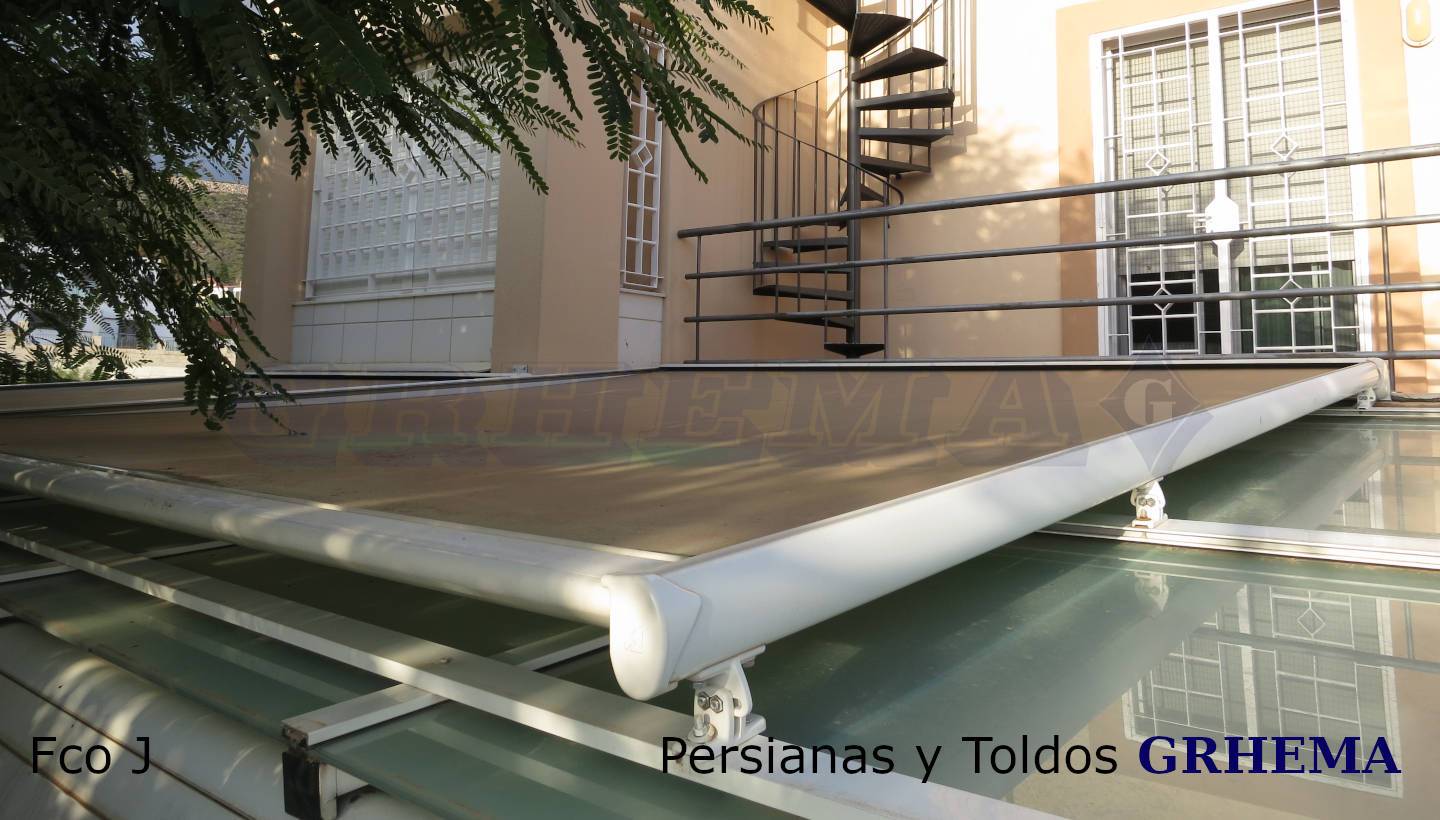 • Toldo corredizo plegable que se desliza debajo de dos guias mediante rodamientos y con apertura y recogida mediante poleas y cuerda.